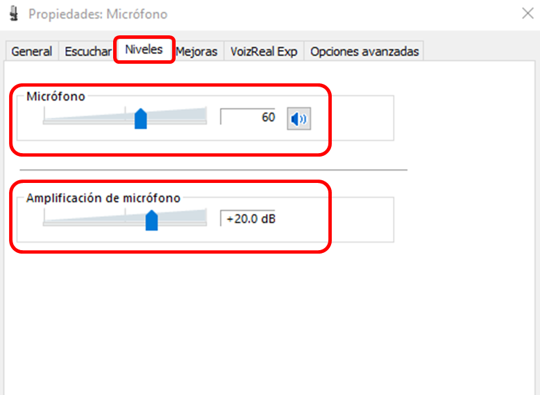 4. Una vez comprobado el paso anterior puede comprobar si el ordenador está recibiendo señal del micrófono desde la ventana de configuración del micrófono de Windows. En esta ventana, al hablar tiene que apreciar como se ilumina la barra de nivel del micrófono
